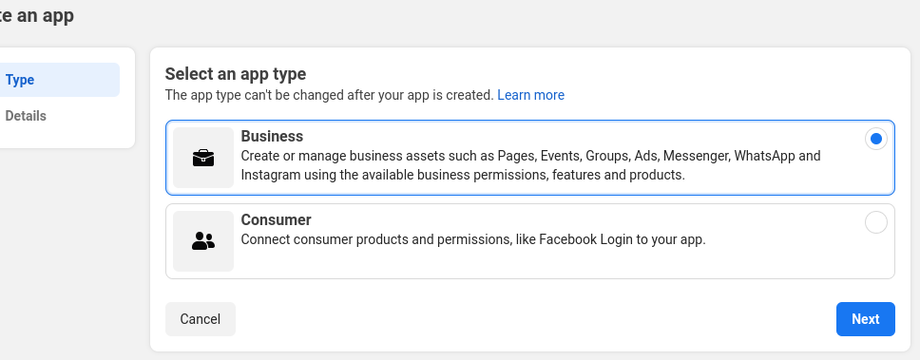 - Go to https://developers.facebook.com/apps and press "Create App". It is recommended to create a business profile first and connect it to the app it when asked.