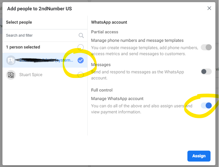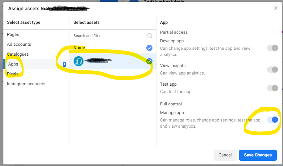 - Now, you'll see the new user created. Click on the "Add Assets". Choose "App" > Select your app > Select "Full control" option then save changes.
