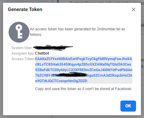 - Phew! We're done with Facebook. Now go back to your 2ndNumber WhatsApp Chatbot and tap "Set Bot Details". Enter the Phone ID in step 21 into the first box and the token from step 20 in the second box.